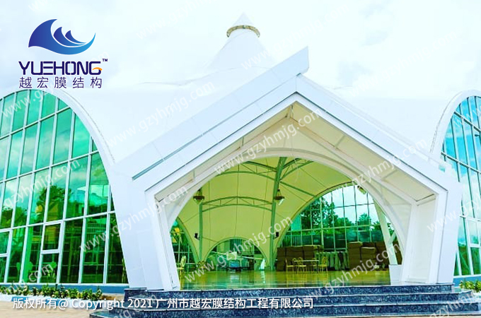 在今次的宴會廳膜結構案例中,所設計出寶塔型的膜結構,及選用玻璃墻整體搭配,體現出宴會廳高端大氣。獨特的外觀能巧妙的成為風景中個性化建筑美,整體空間建筑能讓人感覺是非常高檔的一個場所。